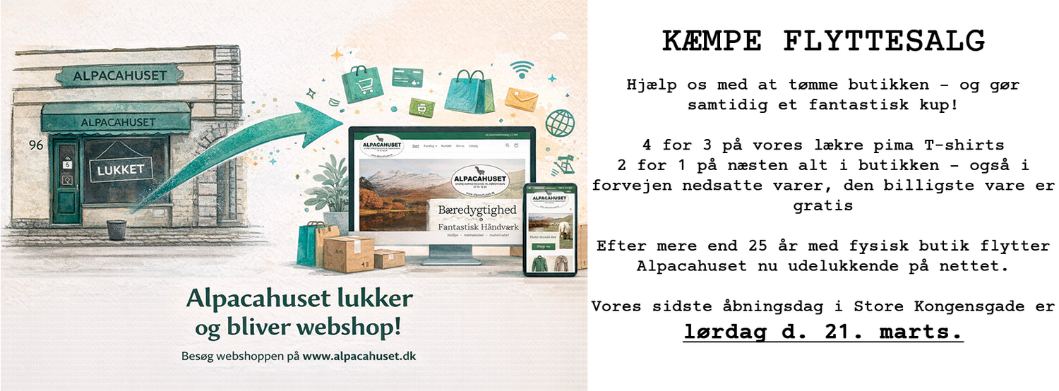Som du måske har bemærket, har Alpacahuset fået en ny og spændende hjemmeside. Nu har du mulighed for at handle både i vores webshop og i vores dejlige butik i Store Kongensgade 96. Webshoppen er netop startet op, og der vil dag for dag komme flere varer i webshoppen, vi har dog altid det største udvalg og den gode service i butikken.
